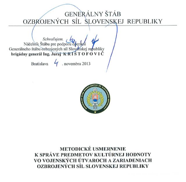 Dňa 4. novembra 2013 bolo náčelníkom Štábu pre podporu operácií Generálneho štábu Ozbrojených síl Slovenskej republiky schválené Metodické usmernenie k správe predmetov kultúrnej hodnoty vo vojenských útvaroch a zariadeniach Ozbrojených síl Slovenskej republiky č. ŠbPO - 75 - 50/2013-OPeP.